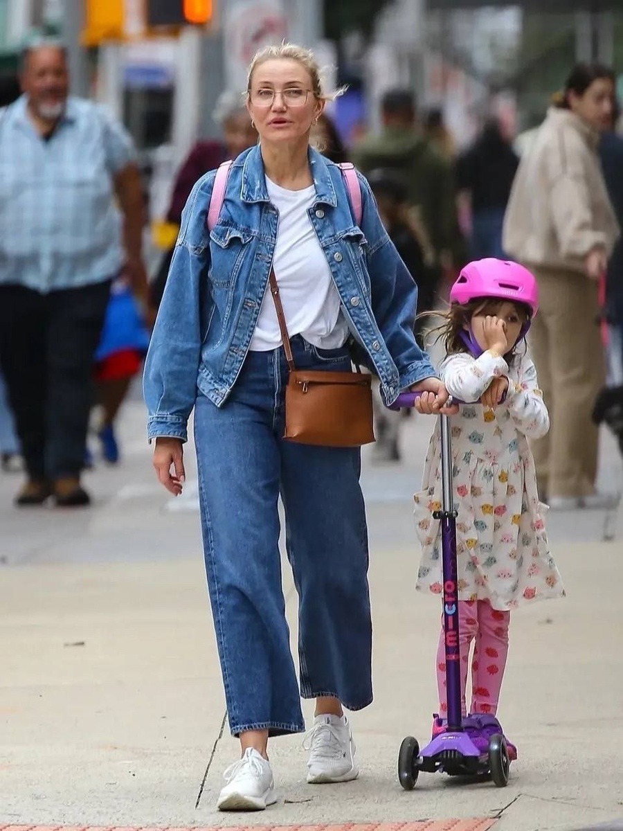 Белая футболка, джинсы, джинсовка. Простой комплект, в котором можно спокойно сходить за хлебом или отвести дочку на прогулку. Без макияжа, расслабленно — и этим подкупает. У Кэмерон особое очарование: она может позволить себе выйти совсем «как все», и это не портит, а наоборот вызывает уважение.