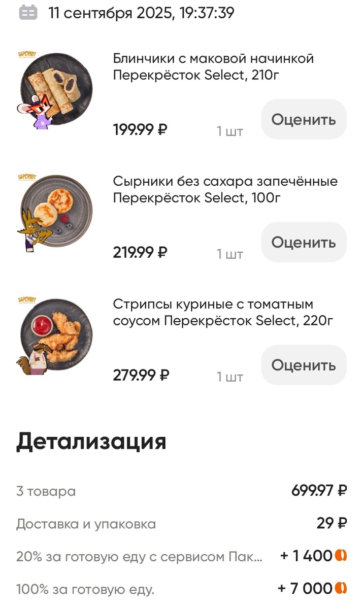 Почта банк прислал предложение "кешбэк 10% на всё" на месяц, максимум 1000 руб. Не пользуюсь этой картой месяцами, поэтому меня так завлекают. 2 раза уже было 15% на всë, теперь 10%. Заказала еду с кешбэком 120% Сырники ела дочка, залив сметаной, сказала, что вкусно. Блины и стрипсы тоже вкусные. Но мало) Мужу опять выпало 50% на супермаркеты в колесе, снова потратила на сертификат Озон. Заказала Дикси с кешбэком 30% от Т-банка. Случайно выбрала самовывоз, а не доставку, пришлось отменять через чат и заказывать снова. Деньги всё равно сняли, вернули через 3 дня, по бонусам надо считать, 30% же по первому заказу дали, а не по второму. Выбрала любимые товары и товары с кешбэком от Т (20%). Hochland, сметана Простоквашино, печенье Алёнка. Очередная экскурсия от муниципального образования. Мне было лень ехать, записала маму. 14.09.2025 Экскурсия«По следам знаменитых авантюристов» Тематическая экскурсия по городу Программа: - тематическая экскурсия по Санкт-Петербургу, посвященная