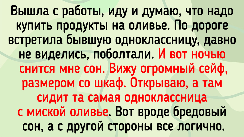 - Вышла с работы, иду и думаю, что надо купить продукты на оливье. По дороге встретила бывшую одноклассницу, давно не виделись, поболтали. И вот ночью снится мне сон. Вижу огромный сейф, размером со шкаф. Открываю, а там сидит та самая одноклассница с миской оливье. Вот вроде бредовый сон, а с другой стороны все логично. © Вероника / ADME