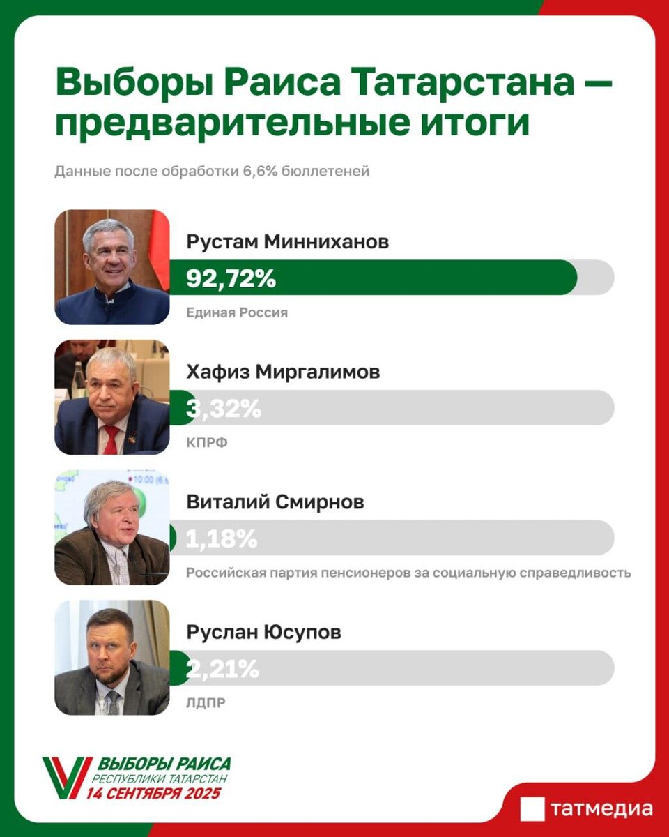 В ответ на пост 📈🗳По предварительным итогам голосования в ЦИК РФ обработано 6,6% протоколов Рустам Минниханов остается лидером голосования за Раиса Татарстана, набирая 92,72% голосов. Второе место занимает Хафиз Миргалимов (3,32%), третье - Руслан Юсупов (2,21%), четвертое - Виталий Смирнов (1,18%). @tatmediaofficial | Все каналы Татмедиа ™️ 1-й новостной MAX-канал Татарстана - подпишитесь.