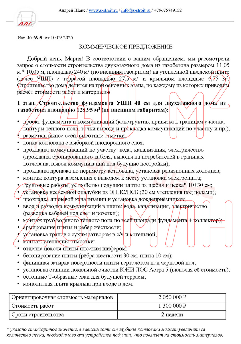 Недавно обратилась потенциальная заказчица с запросом на расчёт стоимости возведения двухэтажного дома из газобетона на фундаменте УШП (утеплённая шведская плита). Мой помощник подготовил коммерческое предложение, с которым можно ознакомиться ниже.