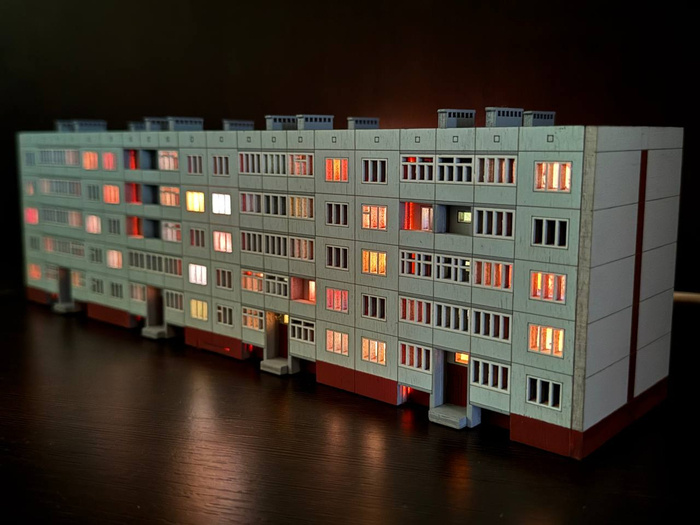 111-121 — Серия крупнопанельных многосекционных жилых домов индустриального домостроения. Первый экспериментальный дом был построен в 1970г. Такие дома строились по всему Союзу местными ЖБ предприятиями и отличались подсерией, этажностью и индивидуальными планировками, в зависимости от места возведения. Некоторые отделывались плиткой, другие белым кварцевым гравием, где-то речной галькой или щебнем. Дома серии 121 стоят в Подмосковье, Нижнем Новгороде, Костроме, Пскове, Казани, Твери, Тольятти, Тюмени, Орле, Оренбурге, Ленинградской области, Великих Луках, Ростове-на-Дону и многих других городах и посёлках. В марте написала заказчица. Хотела сделать мужу подарок. Пробежали по уже деланным моделям, выяснилось, что такого дома, который бы ей хотелось, нет. Прислала адрес и фото. Если делать вариант как я делаю, 1 к 100, то длина при высоте в 20см, вышла бы 65см, что очень крупногабаритно для ночника. Решились на эксперимент, вариант "Супер-мини" в масштабе 1 к 200. Размер такого выходил