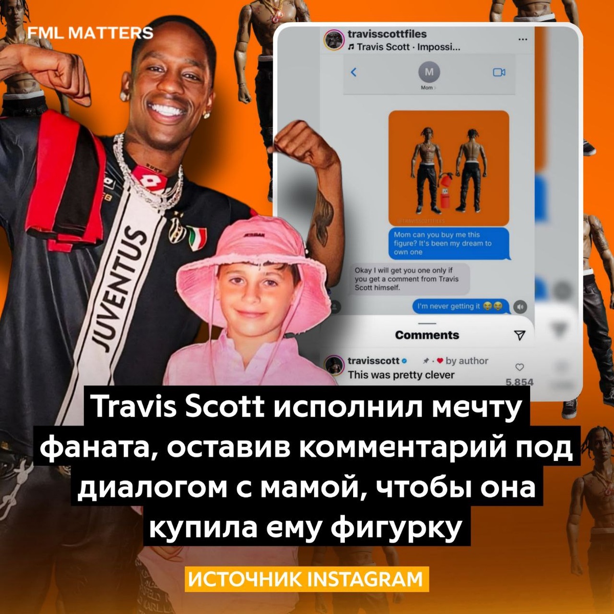 🥰 TRAVIS SCOTT ИСПОЛНИЛ МЕЧТУ ФАНАТА! Жак исполнил мечту маленького фаната, оставив комментарий под диалогом с мамой, чтобы она купила ему фигурку за $1,890: — Мама, купишь мне эту фигурку? Это моя мечта — иметь такую. На что мама ответила: — Хорошо, куплю, но только если получишь комментарий от самого Travis Scott. Фанат расстроился: — Тогда мне её никогда не получить 😭😭 И тут случилось чудо: Трэвис оставил комментарий под их диалогом: — Это было довольно хитро. 💀 FML MATTERS
