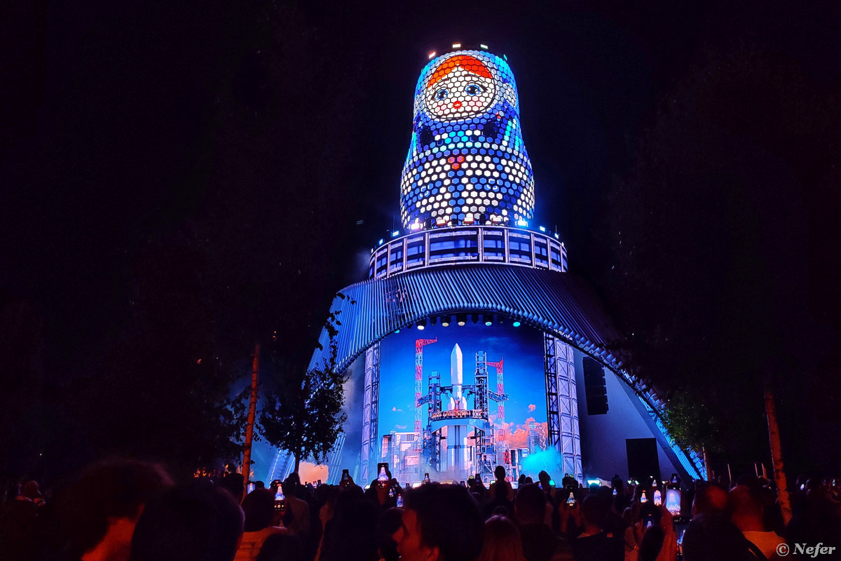 На месте павильона "Купол" в парке Зарядье открыли новый объект - "Матрешка Москвы". Это информационный центр и площадка для мероприятий. Но главное - мультимедийное шоу, которое проходит по вечерам. На крыше расположена конструкция из 30 колец, в каждом из которых 50 выдвижных экранов в форме сот! Кинетическая фигура меняет форму и приобретает различные образы. В обычное время сооружение выглядит так. Просто сцена с гигантским экраном, на котором демонстрируются ролики про Москву и Россию. Но потом все меняется. На крыше вырастает конструкция. Под музыку она меняет форму каждые 1-2 секунды, перетекая из одной в другую. То башня, то ракета, то еще что-нибудь. Одно из главных превращений - матрешка. На видео несколько фрагментов. Впечатление производит. Особенно понравилась первая часть под композицию "Moscow Never Sleeps". Но лучше создали бы оригинальный трек для такой уникальной достопримечательности. Вторая часть шоу очень детская, будто мультфильм смотришь. Медиа-матрешка находитс