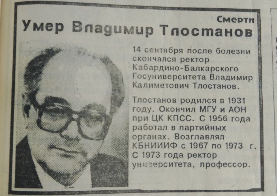 В этот день, 31 год назад, 14 сентября 1994 года, ушёл из жизни Владимир Калиметович Тлостанов — третий ректор Кабардино-Балкарского государственного университета им. Х. М. Бербекова (КБГУ). Возглавлял университет более 20 лет. Некролог из газеты Газета Юга, фото из личного архива. "Мне посчастливилось быть лично знакомым с Владимиром Калиметовичем. Мы с ним говорили об образовательном процессе, научном сотрудничестве. И самое главное, что он воспринял меня как, может быть, молодого специалиста, принял с таким добрым отеческим напутствием. Все время изъявлял возможность и желание встретиться и поговорить. Думаю, что все мы пришли сегодня для того, чтобы от всего сердца выразить своё уважение к этому великому человеку», – Об этом говорил Юрий Камбулатович Альтудов в прошлом году на церемонии возложения цветов. Старожилы Аушигера, откуда родом Тлостанов и где он нашёл свой последний покой, помнят, как студенты университета несли тело своего ректора, укрытого буркой, от начала села до кл