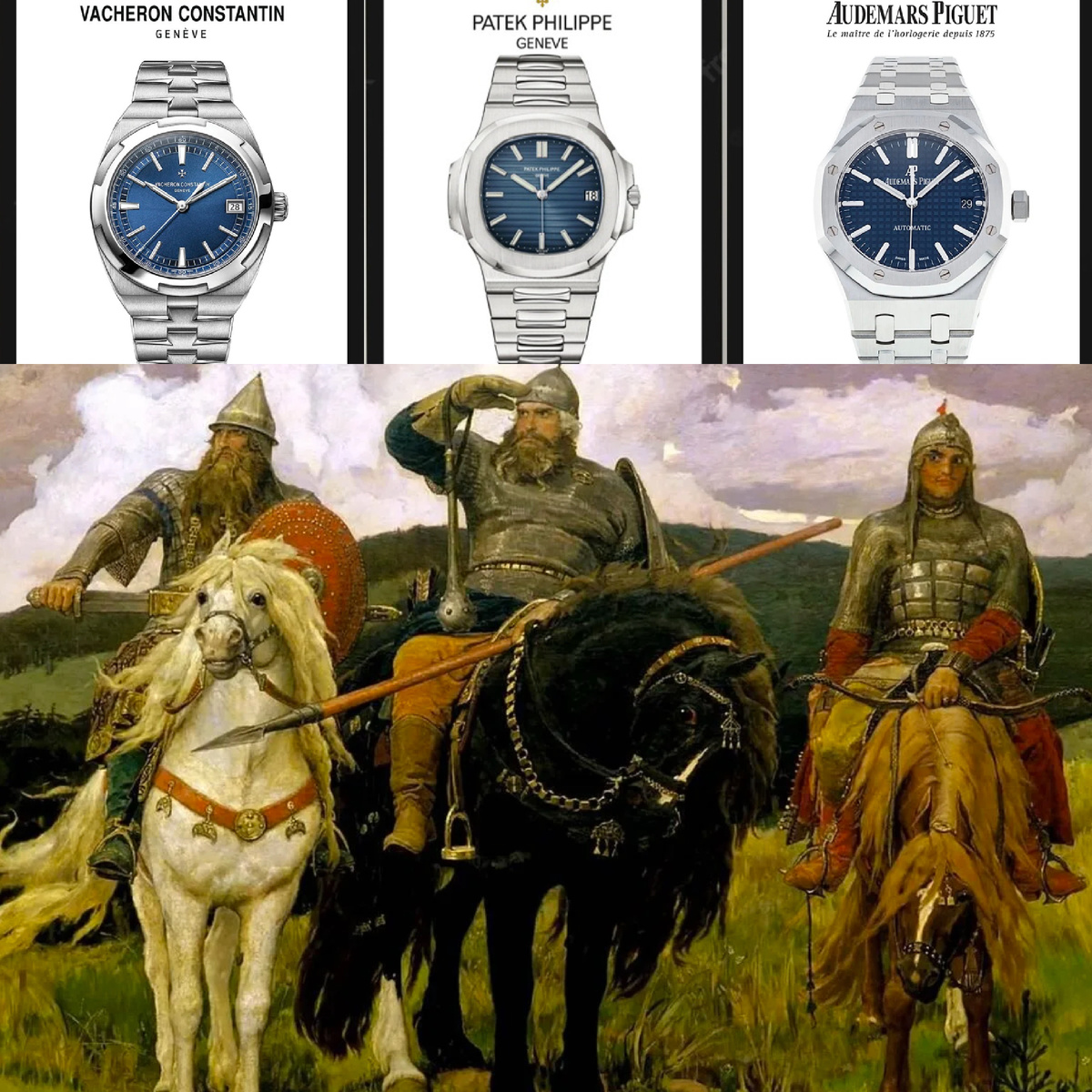 Мне эта тройка напоминает почему-то наших известных русских богатырей (если перенести швейцарский миф на русскую почву): часовое бескрайнее поле, едут по нему три богатыря; посредине - Илья Муромец: мощный, серьезный, самый известный и авторитетный из тройки (Patek); рядом - Добрыня (Vacheron Constantine): он и старше Ильи (Вашерон образовал мануфактуру в 1755 году, Патек и Чапек - в 1839 году), но уступает во влиятельности, хоть и всегда очень рядом с ним; и - Алеша Попович, самый молодой (компания образована в 1875 году): яркий, немного лукавый дамский угодник (Audemars Piguet).