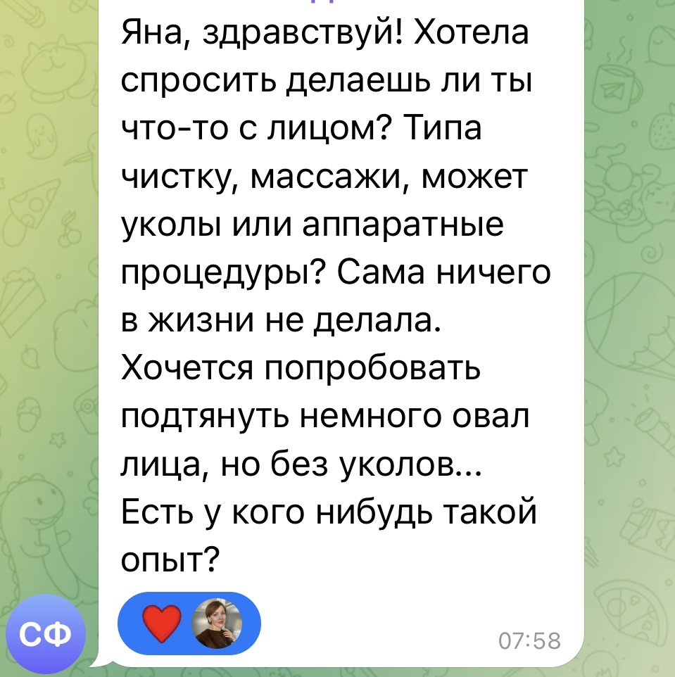 Сегодня отвечаю на вопрос, который волнует многих женщин за 40: можно ли подтянуть овал лица без уколов. Отвечу из личного опыта и как хэлс-коуч🤓 Итак. Моя подписчица Светлана спрашивает: Света, отвечаю на твой вопрос про мой уход за лицом ✨ Ты спросила меня, делаю ли я что-то с лицом — чистки, массажи, уколы или аппаратные процедуры, и возможно ли подтянуть овал без инъекций. Отвечаю как есть: за свои 47 лет ничего такого я не делала. Максимум — это кремы, сыворотки, маски. Когда-то, лет в 20, ходила на чистки. Был у меня опыт – баловалась камнем гуаша, но регулярных массажей не было. Ни уколов, ни аппаратных процедур, ни подтяжек — ничего подобного я никогда не делала. Что касается овала лица… 🤔 Тут всё честно: да, возраст даёт о себе знать. У меня есть небольшой птоз (овал постепенно опускается), есть мимические морщинки вокруг глаз,на переносице, носогубные складки, грыжи под глазами и синячки. У меня усталый тип старения, и всё это я прекрасно вижу. Что это такое? Для тех кто