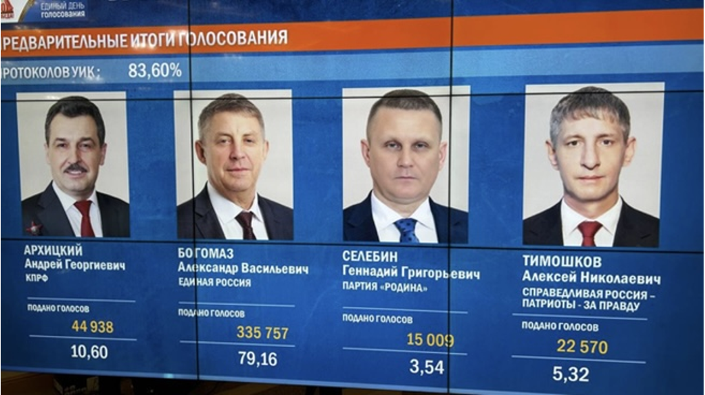 Богомаз набирает 79,16% в Брянской области после обработки 83,6% протоколов