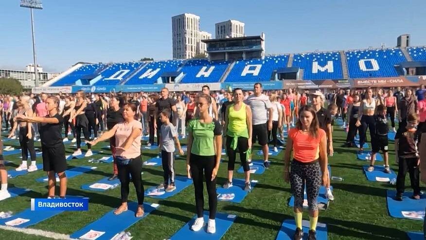 Владивосток стал рекордсменом. На стадионе «Динамо» состоялась самая массовая в России зарядка. Почти 3000 человек пришли воскресным утром на поле, чтобы доказать - Приморье за активный образ жизни. Рекорд зафиксировал федеральный арбитр. От юных хоккеистов до профессиональных баскетболистов и простых жителей края. Это — командная работа. На стадионе Динамо активные приморцы собрались. Вот они, рекорд ставят. Самая массовая зарядка в истории России обзаводится новым адресом: 690091, город Владивосток, Приморский край. Юрий Черных, федеральный арбитр реестра рекордов России: «Официально зарегистрирован новый национальный рекорд. Самая массовая зарядка. Результат: 2907 человек!». Олег Кожемяко, губернатор Приморского края: «Вы все вместе с нами были частицей этого рекорда. И он останется у каждого личным рекордом. Как первый рекорд в России самой массовой зарядки!». Трогательно, что и слез не удержишь. Такая солидарность — дорогого стоит. На широком поле попросту нет свободного места. Ст