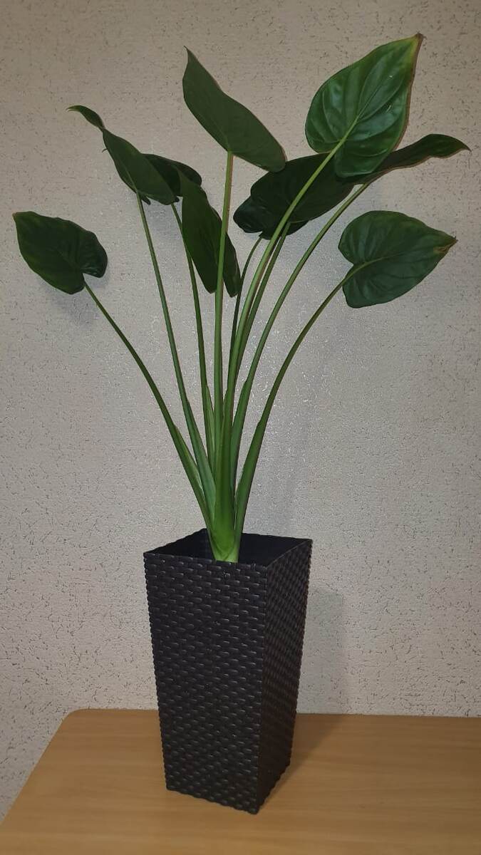 Теперь моя красотка осваивает новые просторы. Недавно начала увеличивать размеры листьев. Держит спокойно минимум 10 листов и их было бы больше, но я постепенно удаляю старые поврежденные листы. Не хочется все разом, тем более они ей не мешают. Как были тогда, так и остаются сейчас. Не отмирают. Высота у нее, с кашпо, больше метра!