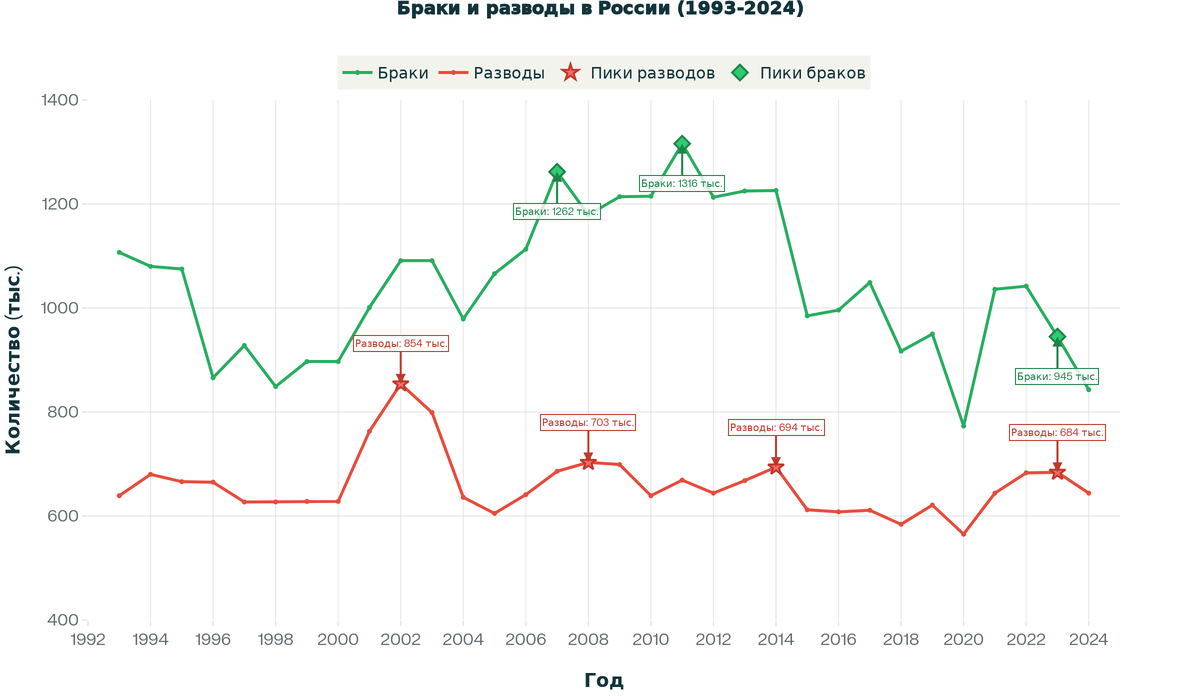 - В 2024 году произошло снижение до 644 тыс. разводов