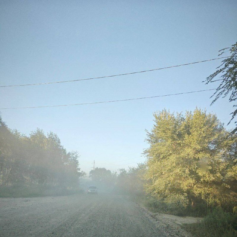 «Здравствуйте, и нет, это не утренний туман перед жарким днём, это столб неполитой дороги, через которую объезжают жители и автобусы, из-за