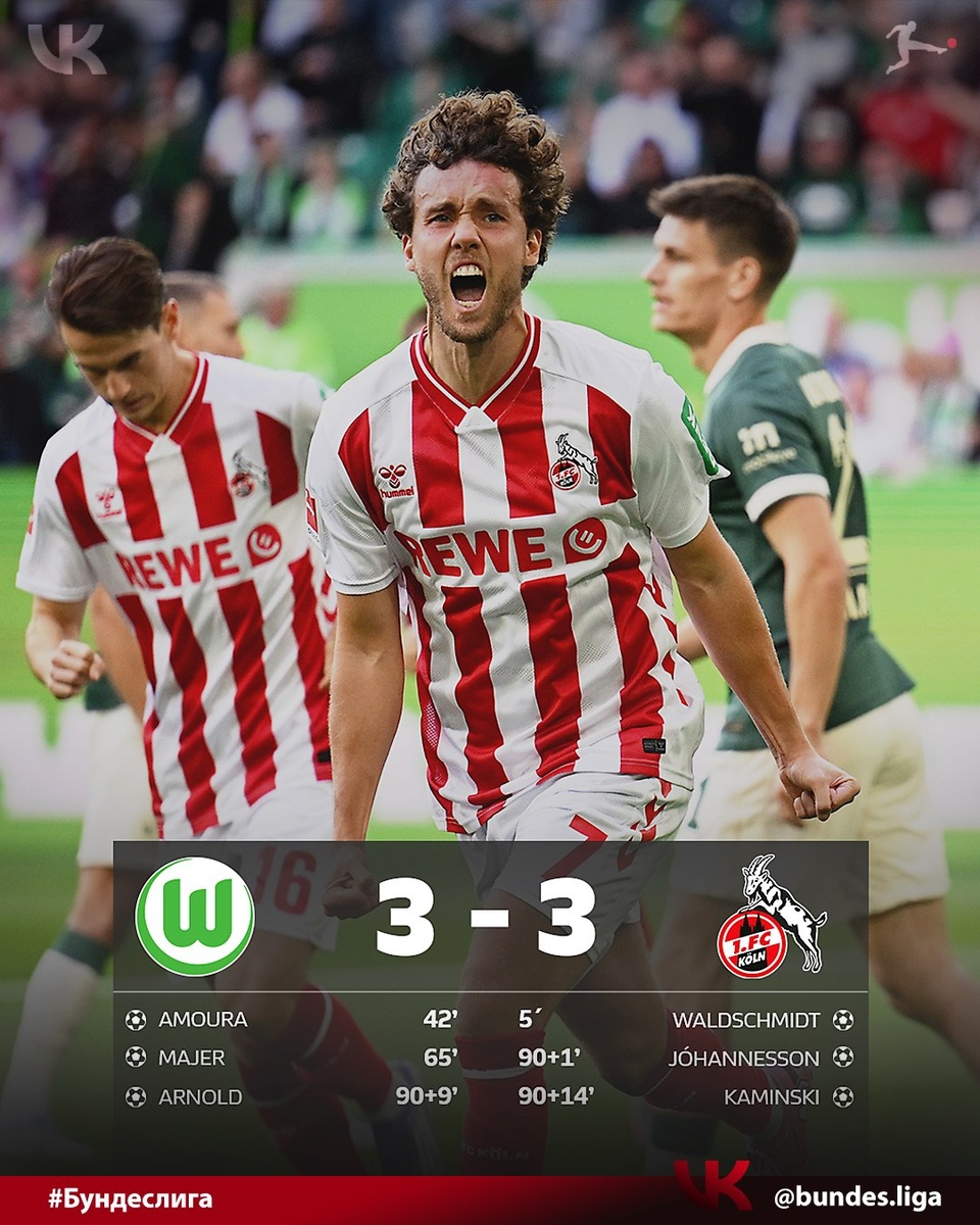 #Бундеслига ⚽ 3 тур. Крутой матч выдали «Вольфсбург» и «Кёльн». «Волки» сыграли с «козлами» 3:3 🤙 ⚽ 05' Вальдшмидт (0:1) ⚽ 42' Амура (1:1) ⚽ 65' Майер (2:1) Все, кто ушёл со стадиона раньше 90 минуты или отключили трансляцию - точно пожалели 😆 Гости сравняли на первой из 14 добавленных минут второго тайма - Исак-Бергманн Йоханнессон был точен (2:2). На девятой добавленной минуте у «волков» сработал удар со штрафного - 3:2. Но «козлы» успели отыграться до финального свистка после попытки Якуба Каминьски. Огненный матч! 🔥 Скоро выложим видеообзор 🎬