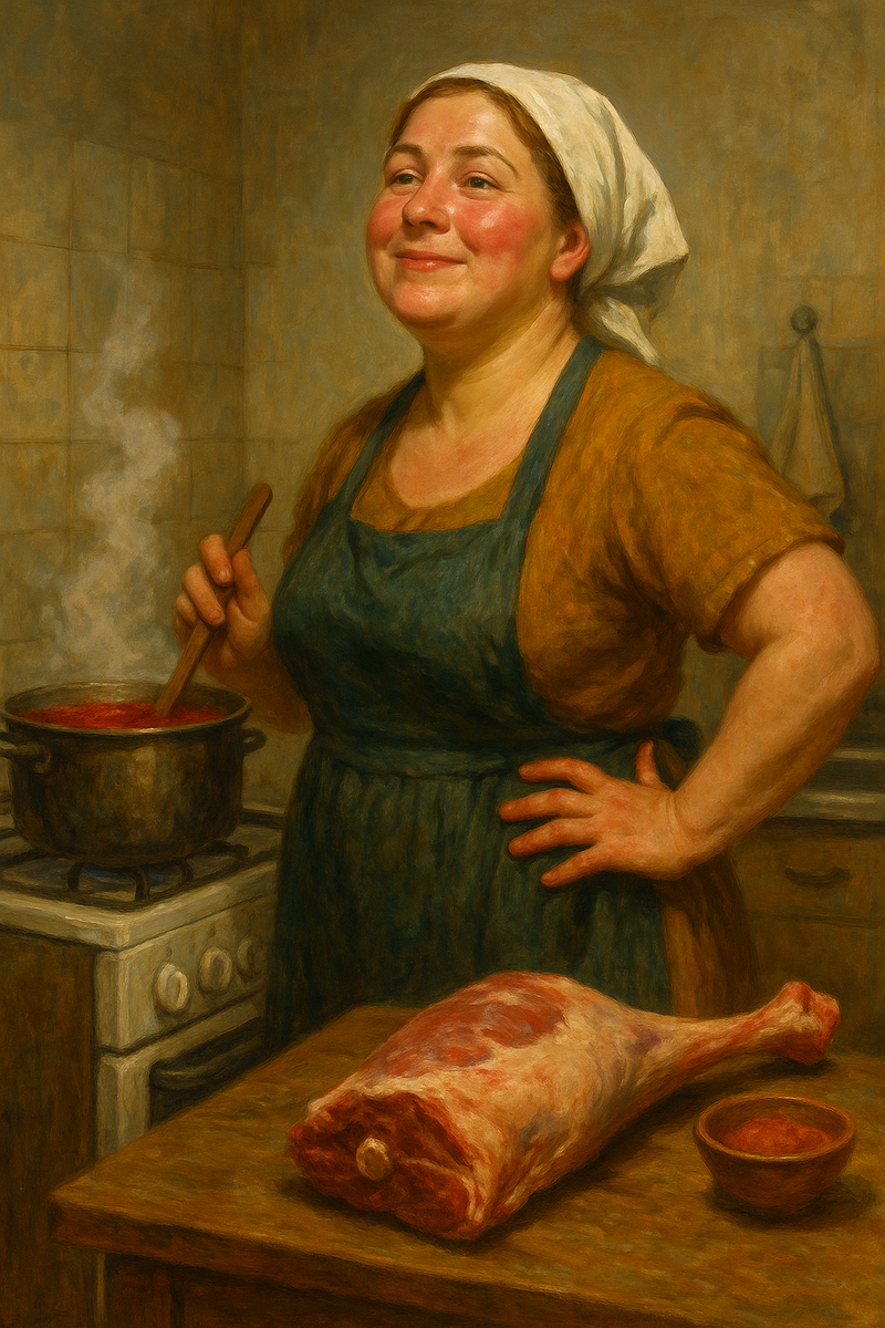 Он летел домой, сердце билось — не от романтики, а от того, что мешок картошки всё-таки тяжёлый. В одной руке — сетка с луковицами гладиолусов, в другой — пластиковый пакет, где звякала банка солёных огурцов. Лепестки роз? Ха! На полу в прихожей он заранее рассыпал шелуху от лука — тоже, в общем-то, органично и «с намёком». Она ждала его, вся в предвкушении… Борщ уже кипел, бульон такой густой, что ложка стояла по стойке «смирно». На плите ритмично булькало, а на кухне над раковиной медленно капала вода, создавая почти шаманский саундтрек. Дверь открылась — он вошёл, сияя глазами. — Любимая, смотри, что я принёс! — и гордо бросил на пол мешок картошки. Стукнуло, как сердце в момент первого поцелуя… только громче. За ним аккуратной змейкой по линолеуму рассыпались луковицы гладиолусов. Она вышла в комнату, вытерев руки о фартук, и застыла. На полу — не свечи, не лепестки, а клубни. Играет магнитофон: «Ах, какая женщина, какая женщина, мне б такую!» — группа «Фристайл» старается из посл
