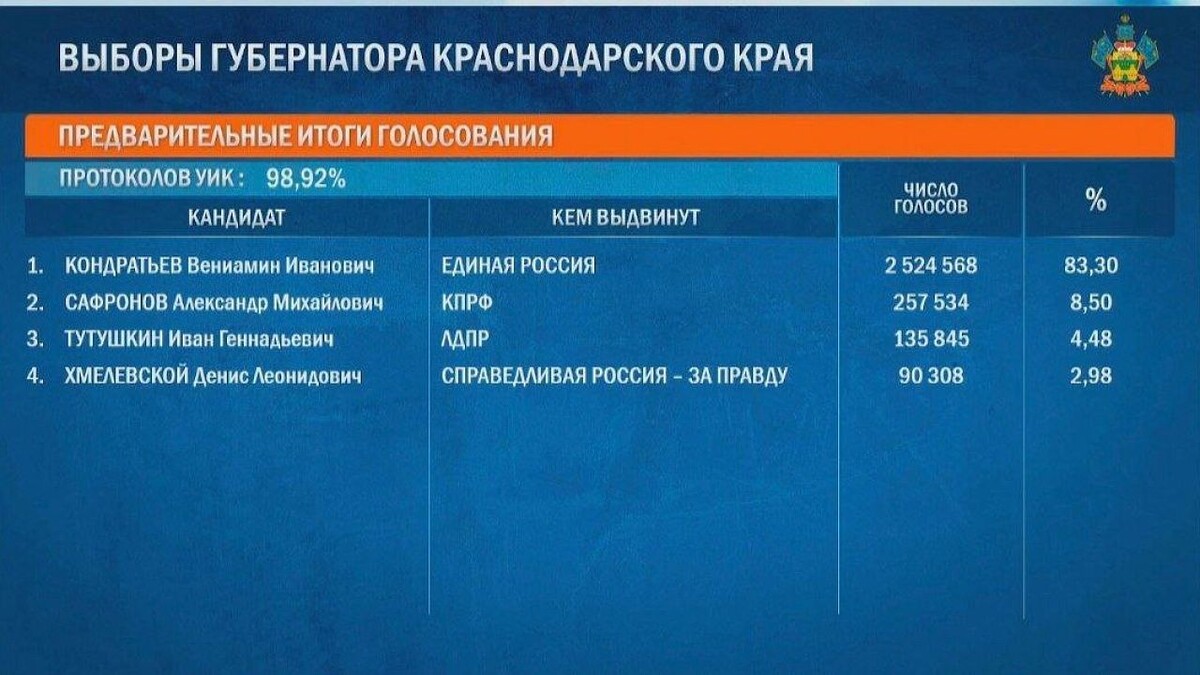 Нынешний губернатор Кубани Вениамин Кондратьева занял первое место на выборах главы региона, сообщает ЦИК России. Он получил 83,30% голосов по результатам подсчета 98,92% протоколов. Второе место у выдвиженца от КПРФ Александра Сафронова - 8,50% голосов. На третьей позиции Иван Тутушкин от ЛДПР - 4,48. Кандидат от партии «Справедливая Россия - Патриоты - За правду» Денис Хмелевской набрал 2,98%. Ранее мы писали, что в ЦИК РФ рассказали о лидерстве Кондратьева на выборах губернатора Кубани.