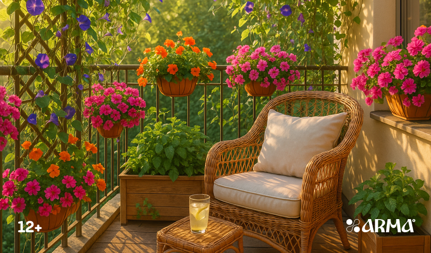 Озеленение балкона – отличный способ насладиться природой прямо у себя дома. Правильно подобранные растения не только украсят ваш балкон, но и создадут комфортную тень, защищая от яркого солнца. Кроме того, они помогут снизить уровень пыли и уличного шума. Давайте разберемся, какие растения лучше всего подойдут для этой цели. Во-первых, растения помогают справиться с летней жарой, естественно охлаждая воздух. Во-вторых, зеленый «занавес» защитит вас от любопытных взглядов соседей и прохожих. В-третьих, это просто красиво и уютно: вы создадите комфортное место для отдыха. Вьющиеся растения стремительно поднимаются вверх, обвивая решетки и натянутые веревки, благодаря чему образуют комфортную тень. Вот самые популярные из них: Выбирая вьющиеся растения, вы не только улучшаете микроклимат, но и создаете стильный и уютный уголок для отдыха. Для того чтобы ваш балкон стал по-настоящему комфортным, добавьте растения, которые привнесут в него живость и уют: С такими растениями ваш балкон стан