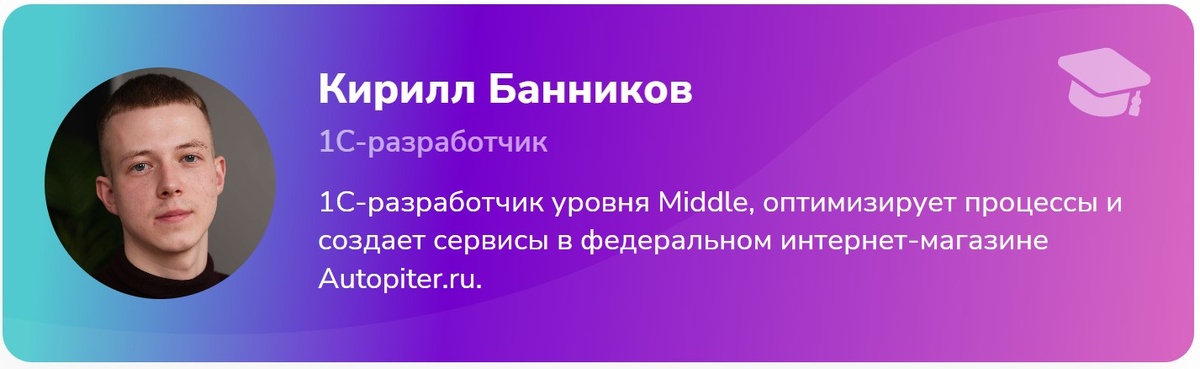 - Автор — Кирилл Банников, 1С-разработчик уровня Middle с реальным опытом в федеральном интернет-магазине Autopiter.ru.