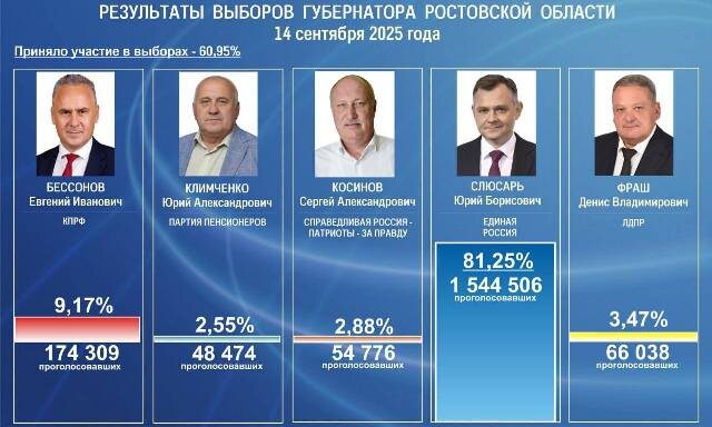 ЦИК РФ утром 15 сентября подводит предварительные итоги выборов. В Ростовской области на выборах губернатора обработано уже 100% бюллетеней. По-прежнему лидирует Юрий Слюсарь («Единая Россия») — 81,25%, 1 544 506 голосов. На втором месте — Евгений Бессонов (КПРФ) — 9,17%, 174 309 голосов. На третьем — Денис Фраш (ЛДПР) — 3,47%, 66 038 голосов. Остальные два кандидата — Сергей Косинов («Справедливая Россия – За правду») и Юрий Климченко («Пенсионеры России») набрали менее 3% голосов. Облизбирком также обнародовал предварительные итоги дополнительных выборов депутата ЗС РО по Орловскому одномандатному округу. Здесь с большим отрывом от остальных победила Зинаида Неярохина, представляющая «Единую Россию». Она набрала 63,38% голосов. По данным Избирательной комиссии Ростовской области, явка избирателей на выборах губернатора составила 60,95%, что является историческим максимумом. Фото: donland.ru