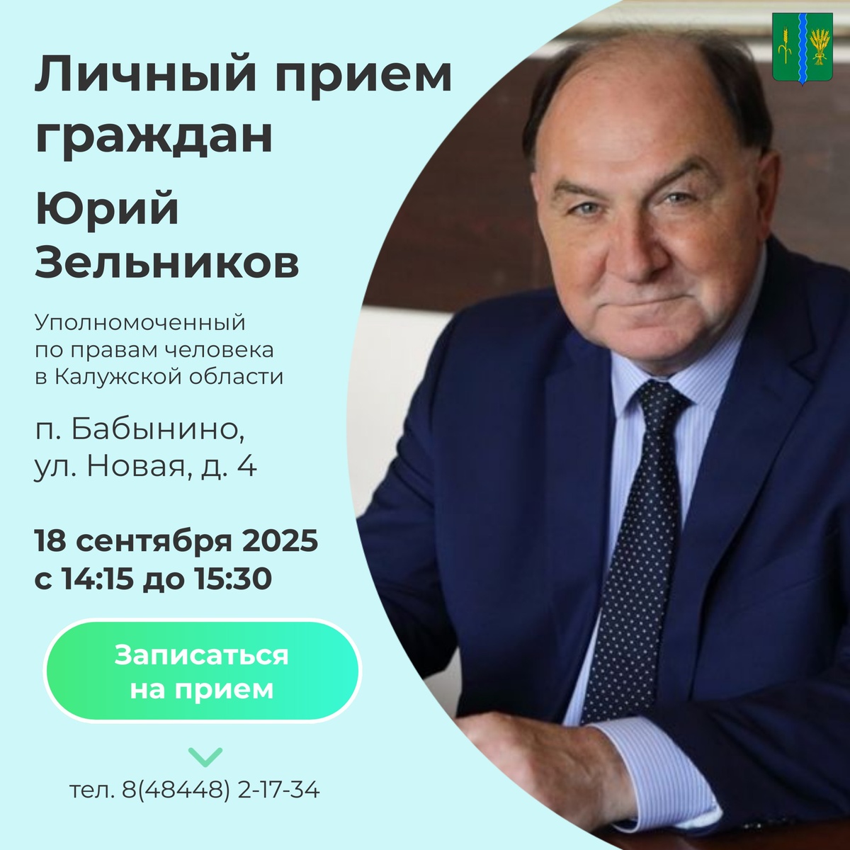 18 сентября 2025 года с 14.15 до 15.30 состоится личный прием граждан, проживающих на территории Бабынинского района, Уполномоченным по правам человека в Калужской области, главой администрации района и районным прокурором. 📍Место проведения - здание администрации Бабынинского района (п. Бабынино, ул. Новая, д. 4). ☎️ Предварительная запись по телефону: 8(48448) 2-17-34.