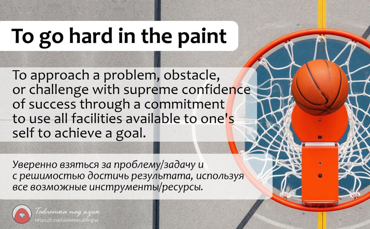 Что значит go hard in the paint? Переусердствовать с охрой, рисуя закат? А вот и нет. Внезапно, эту идиому подарили нам не художники, и даже не маляры, а спортсмены. 🏀 В баскетбольном мире the paint - это прямоугольная зона под кольцом, где страсти накаляются до предела. Именно там идут самые настоящие битвы за мяч. Эта зона обычно обозначена разметкой (paint - рисовать, красить, сущ краска), вот и вся метафора. Go hard in the paint значит действовать с полной отдачей, идти напролом, выкладываться на максимум. Это может быть как настоящий дриблинг под кольцом, так и метафорическая атака на любые жизненные препятствия. Говорят, что выражение пошло в народ после хита Waka Flocka Flame “Hard in Da Paint” в 2010. Сегодня выражение go hard in the paint широко распространено в сленге и обозначает выкладываться по полной, полностью отдаваться делу. Примеры: ⚫️ "He goes hard in the paint at the gym, even on Sunday mornings." (Он выкладывается в зале на все сто, даже по утрам в воскресенье