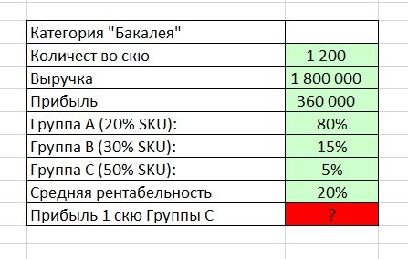 Задачка по оценке эффективности SKU: Давайте в начале недельки снова взбодримся и немного посчитаем?! Дано: В категории "Бакалея" 1200 SKU (артикулов). Общая выручка категории за месяц: 1 800 000 руб. Прибыль категории за месяц: 360 000 руб. Анализ ABC по выручке показал: Группа A (20% SKU): 80% выручки. Группа B (30% SKU): 15% выручки. Группа C (50% SKU): 5% выручки. Средняя рентабельность (Прибыль/Выручка) по категории: 20% (360 000 / 1 800 000). Вопрос: Сколько прибыли в среднем дает 1 скю Группы C? #эффективныйассортимент #управлениеассортиментом #неликвиды