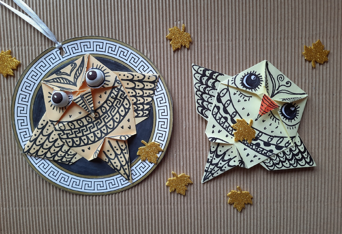 Еще в Древней Греции сова считалась символом мудрости, священной птицей познания и спутницей Богини мудрости Афины (она же по совместительству - Богиня войны). Изображения Афины и совы чеканились на серебряных греческих монетах, которые в просторечии так и назывались «совами»: на одной стороне монетки профиль Афины, на другой - сова. Поэтому сова еще считается символом денежной удачи. В семье, где есть школьники или студенты, сова должна занимать почётное место на письменном столе или полке с книгами. Достаточно даже поместить изображение птицы на стене в детской комнате. Присутствие совы будет стимулировать тягу к знаниям, и способствовать успешной учёбе и благоразумию (очень на это надеюсь))). Поэтому каждому из нас просто необходим мудрый талисман - сова. Давайте сделаем птицу Мудрости в технике оригами. Потребуются: половина листа офисной цветной бумаги, клей, ножницы и черный маркер. Из листа А5 (половина А4) выделяем квадрат. Оставшийся лоскуток будет нужен для крыльев. Дв