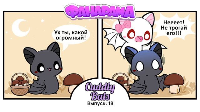 В восемнадцатой части милых и трогательных комиксов про веселые моменты из жизни пары летучих мышек, прикольные истории на темы: не трогай этот гриб, слишком много блестяшек, место для объятий, и другие забавные ситуации вызывающие улыбку и наполняющие сердце теплотой. Когда солнце ложится спать и звезды украшают небо, маленькие глазки в тени просыпаются. Они расправляют крылья, широко зевают и улетают в лунный свет. Или, по крайней мере, это то, что вы ожидаете от летучих мышей, верно? Как насчет того, чтобы вместо того, чтобы улететь в ночь, они пошли на кухню и испекли шоколадный пирог? Или приготовить пиццу и сходить в кино? Ну, это определенно то, что сделала бы пара приятных летучих мышей Луна и Тень. Тебе становится любопытно? Тогда давайте вместе заглянем в их милый маленький мир. Милый дуэт летучих мышей, которые просто любят обниматься, готовить пиццу и вместе ходить в кино, делятся своими трогательными и часто забавными историями, которые очаруют вас своей привлекательностью