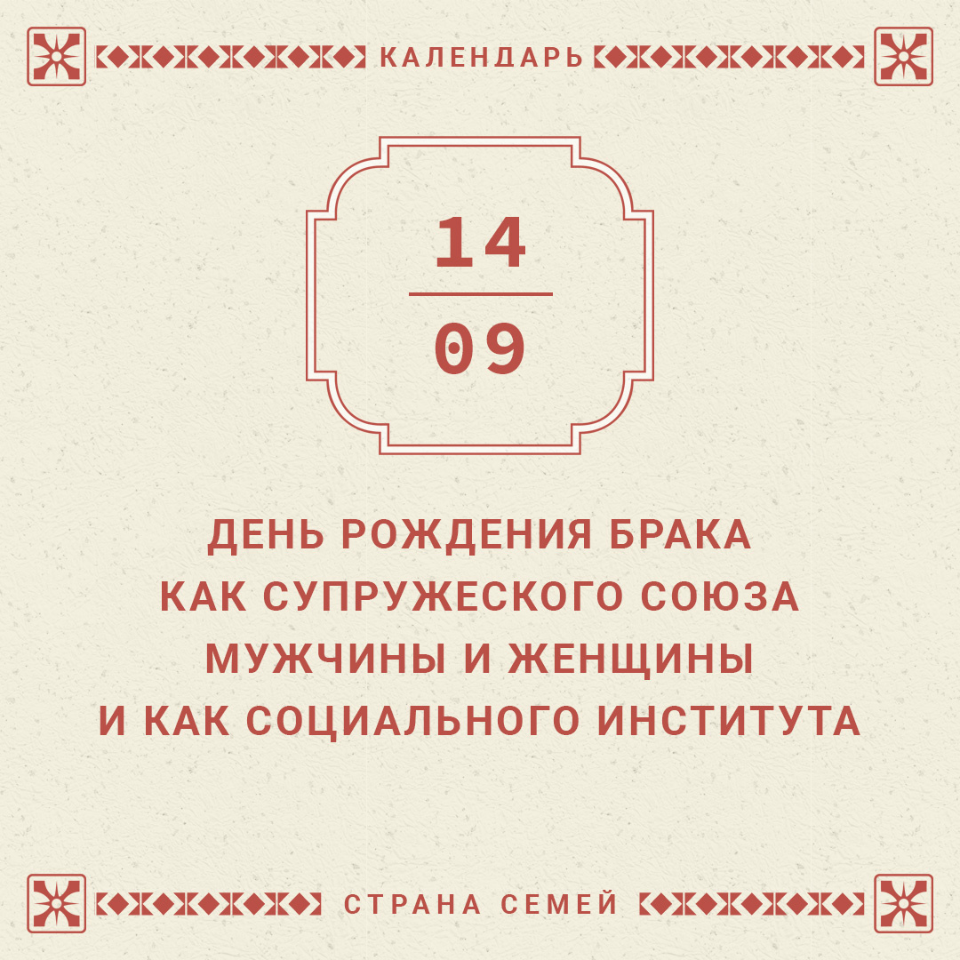 14 СЕНТЯБРЯ: ДЕНЬ РОЖДЕНИЯ БРАКА КАК СУПРУЖЕСКОГО СОЮЗА МУЖЧИНЫ И ЖЕНЩИНЫ И КАК СОЦИАЛЬНОГО ИНСТИТУТА