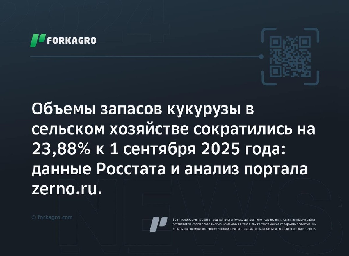 Объемы запасов кукурузы в сельском хозяйстве сократились на 23,88% к 1 сентября 2025 года: данные Росстата и анализ портала zerno