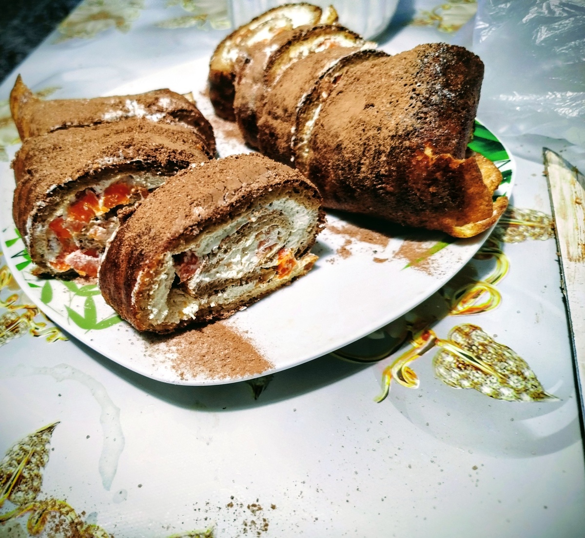 Сегодня готовим рулет-тирамису с курагой. Не обязательно ждать праздника или какого-то повода для такого вкусного десерта, тем более он низкокалорийный. 🧑🍳 "Для бисквита. Яйца — 3 шт. (белки и желтки отдельно). Йогурт или кефир — 120 мл. Мука рисовая — 55 г. Соль — щепотка. Ванилин — по вкусу. Подсластитель — по вкусу. Разрыхлитель — 1 ч. л. Для пропитки. Крепкий заваренный кофе — 100 мл. Подсластитель — по вкусу. Для крема. Творог — 170 г. Йогурт (или сметана)— 170 г. Шоколад — 20 г (мелко порубить). Подсластитель — по вкусу. Мякоть апельсина — 120 г (по желанию). Дополнительно. Какао-порошок для украшения. Процесс приготовления. 1. Готовим бисквит: Взбейте белки с щепоткой соли до крепких пиков. В отдельной миске смешайте желтки, йогурт (или кефир), муку, ванилин, подсластитель и разрыхлитель. Аккуратно введите взбитые белки, перемешивая лопаткой движениями снизу вверх. Вылейте тесто на силиконовый коврик и выпекайте при 180 °C 15–20 минут (ориентируйтесь на свою духовку). Гот