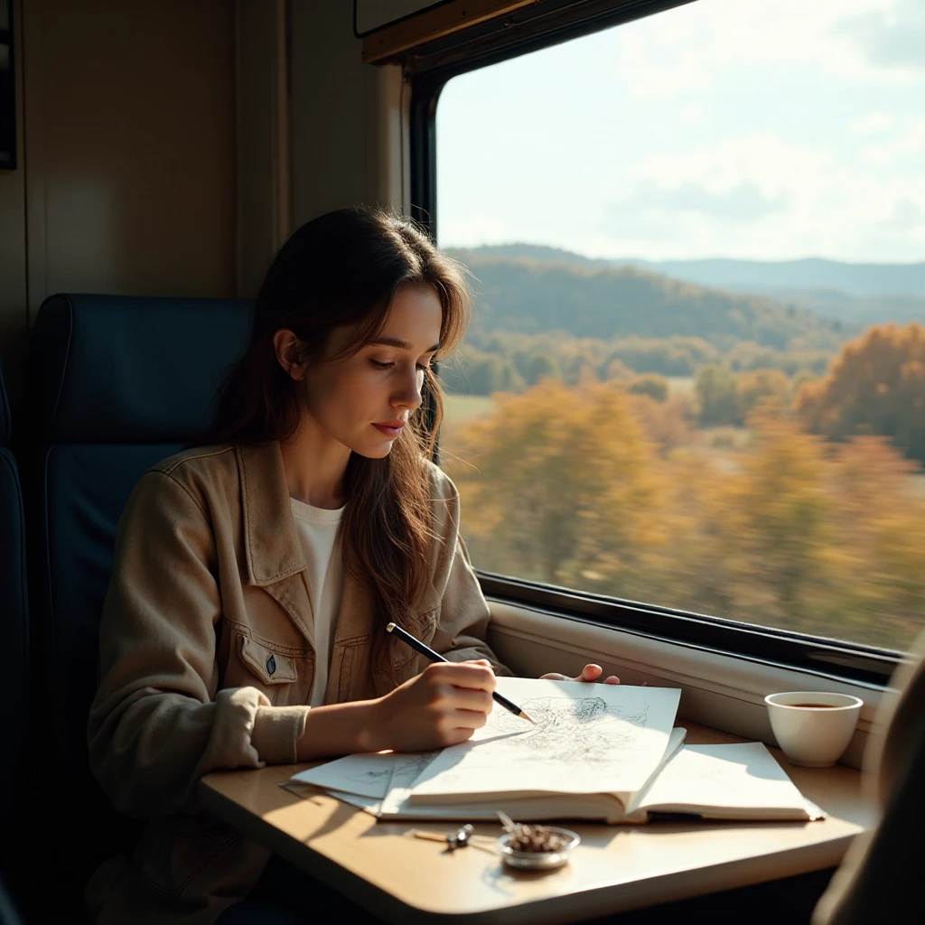 Они заходят в вагон. Алёна находит своё место у окна, устраивается с сумкой и скетчбуком.