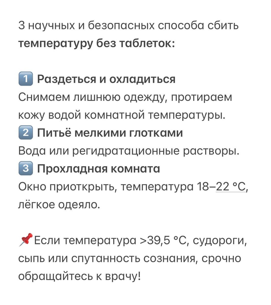 Саша пошёл в сад в 2,5 года. Думала, до выхода на работу 6 месяцев. Ребёнок адаптируется. Спокойно выйду на работу. Не тут-то было. Начался «день сурка». ✅Утром в сад привела, вечером забрала с температурой 39. ✅Две недели болеем, неделю отдыхаем, снова в сад. Вечером снова температура 39. ✅На 4 раз мы поставили сад на паузу. На год. 📌Температура у Саши всегда была высокая и по 5–6 дней. Старалась не перегружать его лекарствами: ▪️чередовала ибупрофен и парацетамол, ▪️давала половину дозы, чтобы сбить до 37,5–38°, а не до «идеальных» 36,6. Параллельно использовала физические методы: ▪️дома держала прохладу (18–20°), ▪️одевала его в тонкий комбинезон и иногда лёгкую шапочку, чтобы не мёрз. Так организм «остужается» через дыхание. Холодный воздух согревается в лёгких за счёт тепла тела и температура снижается. Метод рабочий, проверено на личном опыте и научно обосновано. 📌 В памятке ниже я собрала ещё пару простых и безопасных способов⤵️ А вы как сбиваете температуру? Используе