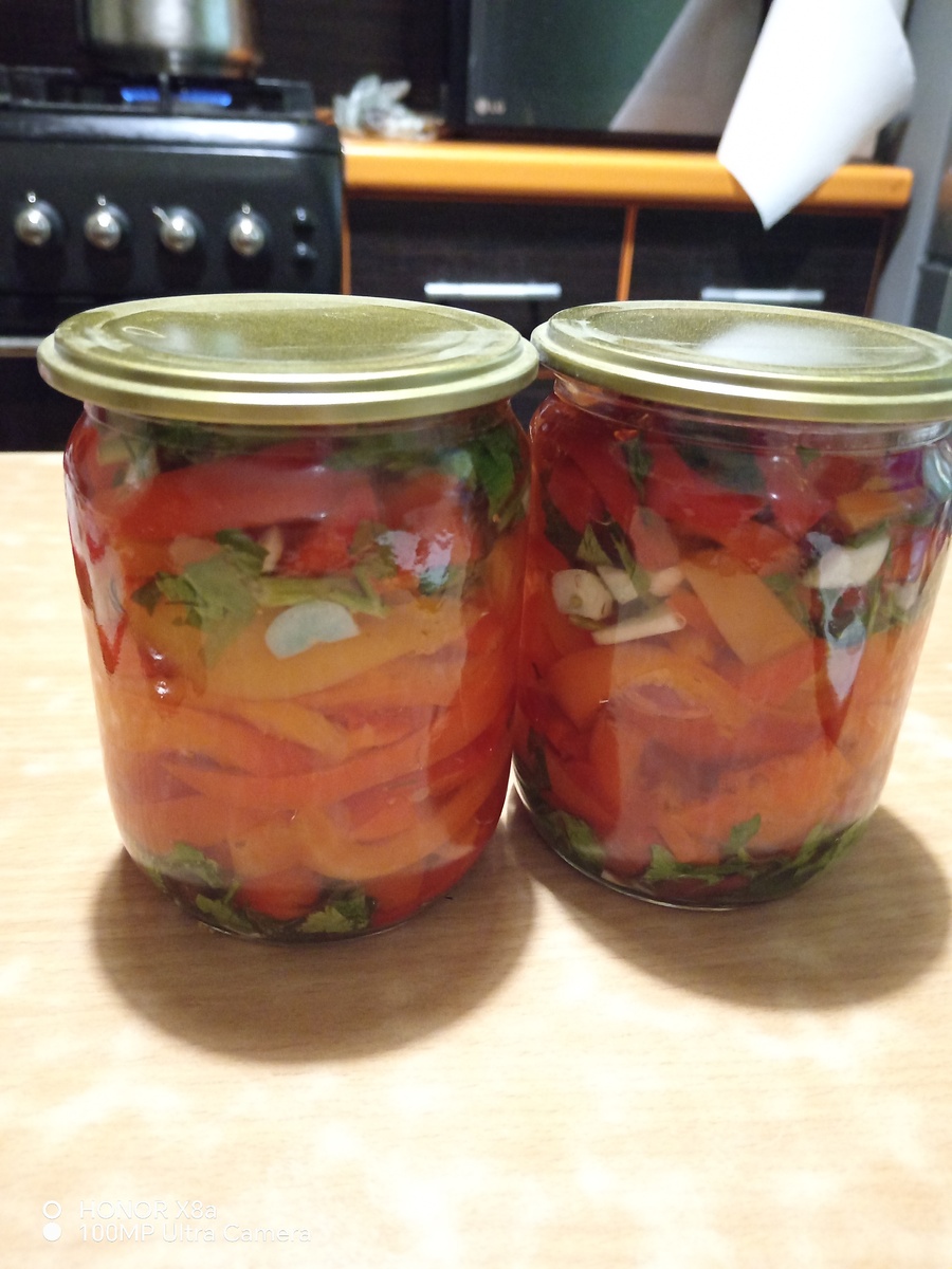 Ингредиенты на 2 литра : Душистый перец 5-6шт на 0.5л. Вода-500-600мл Болгарский перец-1 кг Чеснок 6-8 зубчиков Перец острый 1 часть (я заменила, т. к. у меня не было острого перца на кетчуп чили "махеев". Петрушки - 1пучок Уксус столовый 9%-4ст.ложки(у меня банки по 0.5л по 1ст.ложки) Сахар - 2ст.ложки Соль-2ст.ложки Масло подсолнечное по 3 ст. ложки в каждую банку. Приготовление : Моем перец чистим и нарезаем на дольки, добавляем 500-600мл воды, ставим на огонь и кипятим перец 3-4минуты. Чеснок и петрушку нарезаем мелко, все смешиваем и раскладываем по банкам. Туда же в банки добавляем душистый перец по 5-6штук, в каждую банку. Затем кладём острый перец. Наливаем масло, добавляем перец бланшированный, наполняя банки до верха, чередуя слои с зеленью и чесноком. Добавляем уксус 1 ст. л. Кладём соль и сахар, заливаем банки рассолом в котором варили перец. Тем временем подготавливаем ёмкость в которой будут стрелизоваться банки, на дно кастрюли не забудьте положить полотенце. Стер