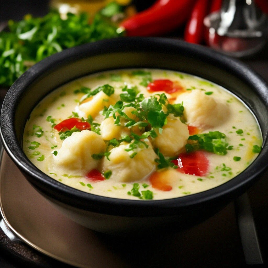 Ваш сливочно-кремовый суп с нежными рыбными клецками готов! Приятного аппетита!