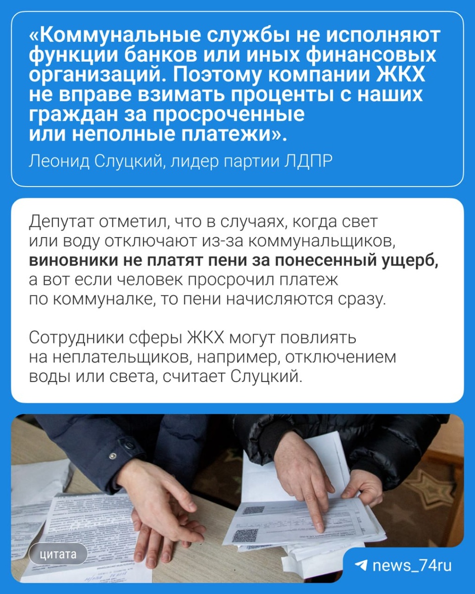 В Госдуме хотят по-новому считать долги за ЖКУ Депутат Леонид Слуцкий считает необходимым запретить коммунальщикам взимать проценты за просроченные платежи. Зачем нужен такой запрет и как предлагают влиять на неплательщиков, читайте в карточке @74.ru ⬆️ А у вас есть долги за ЖКУ? 😎 нет, оплачиваю вовремя ❤️ точно, надо же заплатить! 🥲 есть и большие