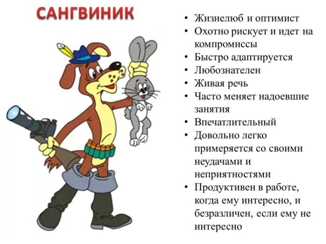 САНГВИНИК Сангвиники более уравновешенны и эмоционально устойчивы, чем холерики, для них характерна сбалансированность процессов возбуждения и торможения. Они тоже быстро возбудимы, но эмоции менее глубокие и сильные, чем у холериков. Чувства легко возникают и быстро сменяют друг друга. Для них также характерна штурмовщина при подготовке к экзамену и некоторая переоценка своих сил и возможностей (иногда — вплоть до зазнайства). Но отношение к опасным ситуациям — расчетливое, без особого риска, характерного для холериков. Они способны не впадать в панику в стрессовых ситуациях, не теряют самообладания в критические моменты. Сангвиники стремятся к быстрому достижению поставленной цели, стараясь при этом избегать препятствия. После стрессовой ситуации они довольно быстро приходят в себя, поскольку им присуща высокая адаптивность, но в процессе выполнения деятельности необходима похвала и одобрение. Их отличает оптимистично-реалистичное отношение к жизни, всегда хорошее настроение, высокая
