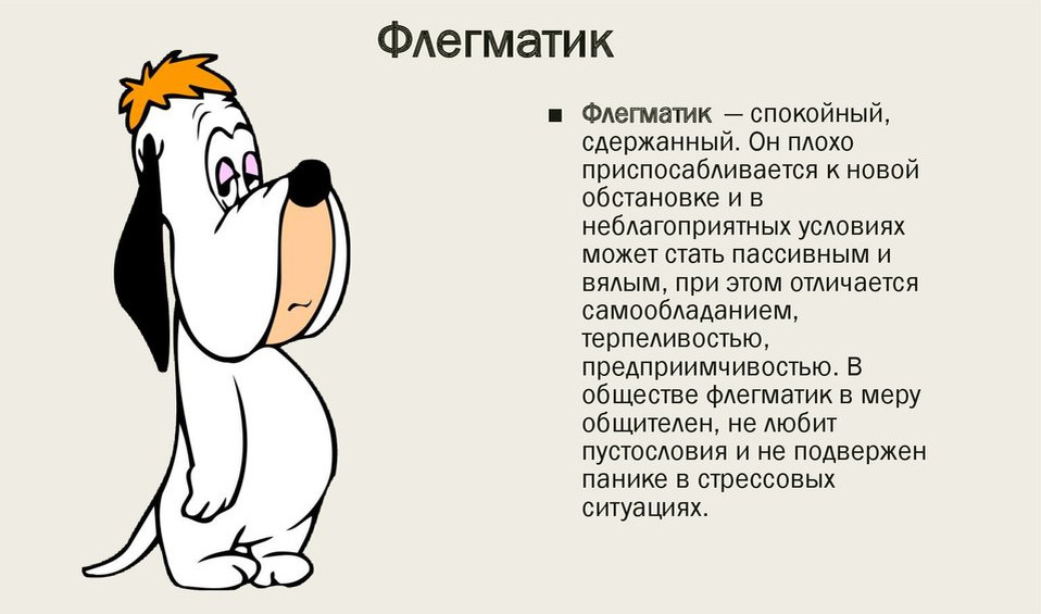 ФЛЕГМАТИК Флегматики обладают уравновешенной инертной нервной системой, что проявляется в медлительности движений, речи, в добросовестности, основательности, неторопливости, невозмутимости. Флегматики характеризуются низкой чувствительностью и эмоциональностью, бедной мимикой, маловыразительными движениями и интонацией. Они реагируют на различные ситуации, в том числе и на стрессовые, спокойно и медленно. По мнению Р. М. Грановской, холерики в провоцирующей ситуации реагируют сразу же вслед за раздражителем, демонстрируя вспышку в виде аффекта даже при однократном травмирующем воздействии. У флегматика же необходим процесс накопления раздражения и суммарный результат должен преодолеть значительное торможение, прежде чем начнется разряд. Вспышка может носить отсроченный характер, произойти через определенное время после провокации. В экстремальных условиях эта отсрочка у флегматиков и меланхоликов значительно увеличивается, ответное действие или реплика запаздывает, что может затруднять