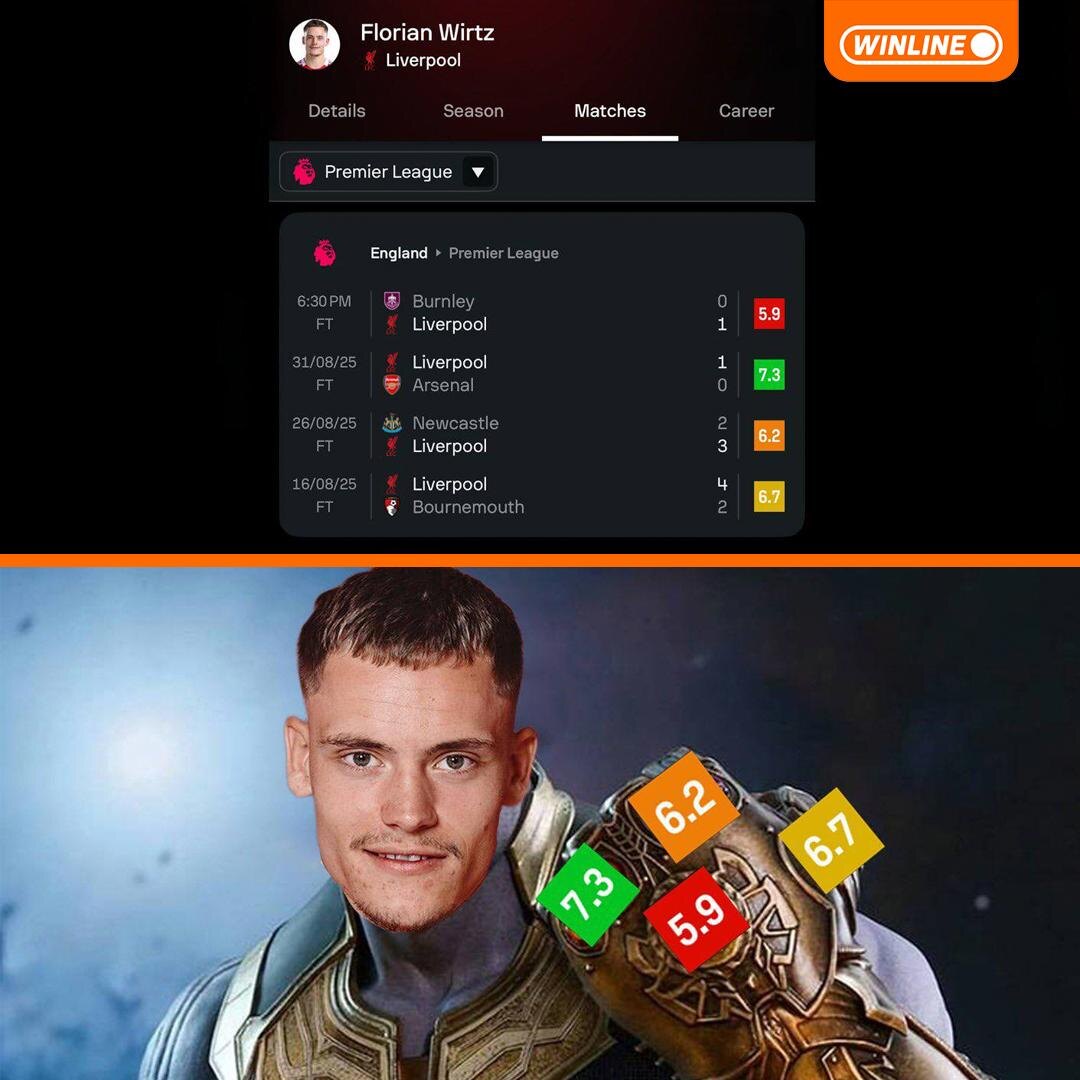 В ответ на пост 🏴 Вирц буксует в Ливерпуле? Пока его новая команда перенимает камбэчный стиль игры чемпионского Байера, Флориан еще набирает кондиции. За последние 4 игры он собрал камни бесконечности оценки всех цветов: