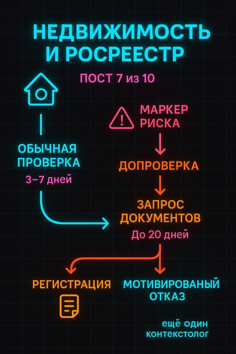 Недвижимость и Росреестр. Пост 7 из 10 серии про законопроект о борьбе с мошенничеством в России. Кого касается: девелоперы, застройщики, нотариусы, юристы по сделкам, агентства и любые компании, где оборот залогов и купли-продажи недвижимости. Коротко. В проекте предлагают давать Росреестру больше времени на регистрацию права, если у сделки есть признаки риска. Срок могут увеличить до 20 дней. Плюс дополнительные проверки. Это пока проект, но шанс принятия высокий, поэтому планируем процессы с запасом. Что меняется по сути? Регистратор видит маркеры риска и переводит дело на углубленную проверку. Регистрация может занять до 20 дней вместо привычных 3–7. Возможны запросы допдокументов и сверки по нескольким госбазам. Как подготовиться бизнесу уже сейчас. 1️⃣ Планируйте сроки с буфером. В договорах: укажите срок регистрации до 20 рабочих дней при назначении углубленной проверки. В графиках ввода и DDU: добавьте 2–3 недели к критическим узким местам. Для ипотечных сделок: зара