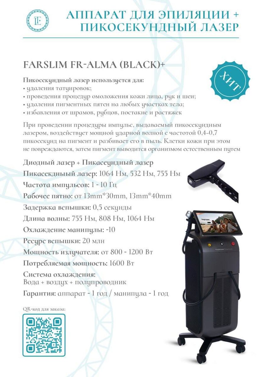 АППАРАТ 1️⃣ А ЭФФЕКТОВ ОТ НЕГО - 5️⃣ 🫣🫣🫣 Возможно ли? Да!✅ Диодный лазер FARSLIM FR-ALMA (BLACK+) с пикосекундным лазером - это инновации для вашего бизнеса! 🔥 ОН ИСПОЛЬЗУЕТСЯ ДЛЯ⤵️ •удаления татуировок; •проведения процедур омоложения кожи лица, рук и шеи; •удаления пигментных пятен на любых участках тела; •избавления от шрамов, рубцов, постакне и растяжек. И ЭТО ВСЕ ПОМИМО ЭПИЛЯЦИИ!🔥 Такие процедуры всегда и везде актуальны, поэтому ваш бизнес безусловно пойдет в гору, следуя нашим советам! ✨