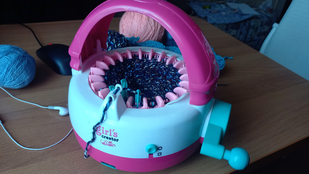 Я очень долго мечтала о вязальной машине, хотя бы такой. И мечта девочки сбылась, мне ее отдали. Сразу скажу - хорошо, что сама не купила. В продаже очень много подобных машинок. Тип - мельница. Надеюсь, никому не надо объяснять, почему тип так называется. Цена варьируется от 800 до 4500 рублей. Названия у них разные - и а-ля русская "Зимушка", в Леонардо видела - "Hobbius", на маркетплейсах есть "Сhildren's knitting" и тп. У меня Girls Creator. Сделаны они на одном заводе в Китае, просто потом брендируются под заявки. Так что все одно пальто. Казалось бы, самое сложное - это первоначально вставить нить и завести эту самую нить попеременно в и за крючочки. Но нет. Спойлер - снять вообще высший пилотаж. Но даже не об этом сейчас, научиться снимать и закрывать петли я бы научилась. Но почему это делать не буду: Мне стало интересно, почему же машинка рэндомно скидывает петли? И я даже разобрала ее, но внутри все было в идеале. Потому эксперимент продолжался и с нитью потоньше, и потолще.