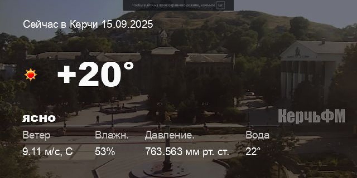 Погода в Керчи 15 сентября Сегодня днем в Керчи, 15 сентября, ожидается ясная погода, температура воздуха от +18° до +22.7°С, ветер северный 4.35 м/с, порывы до 12.26 м/с, давление 762.8 мм рт. ст., влажность 51%. Ближайшей ночью ожидается пасмурная погода, температура +20°С. Завтра, 16 сентября, в течение суток ожидается пасмурная погода; ночью +20°С, днем +20.2°С, ветер северный 6.66 м/с. - Феодосия от +16.9° до +22.2°С, 🌞 ясно, море: 20°C - Судак от +13.2° до +19... подробнее Подписывайся на КерчьФМ.РФ @kerchfm