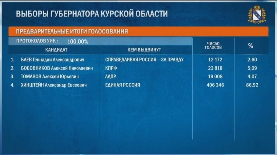 Хинштейн набирает 86,92% голосов на выборах губернатора Курской области