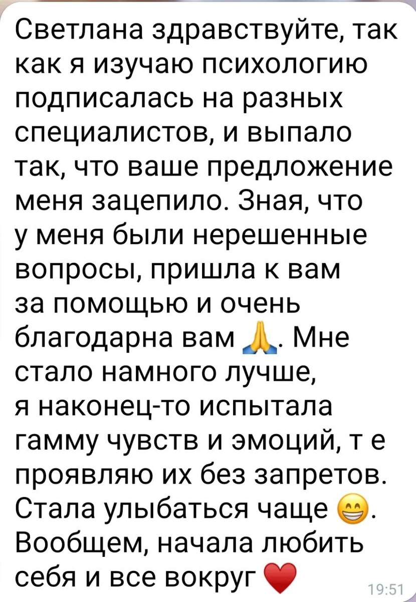 Полюбила себя и все вокруг, после долгих лет апатии.🙏 Хочу сегодня с вами поделиться небольшим отзывом, который прилетел очень неожиданно для меня. У меня есть разрешение делиться и рассказывать. Мы работали около 2 месяцев над тем, чтобы вернуть радость и энергию.🫶 Мария (имя изменено) пришла ко мне с запросом, что она не может понять, какие чувства она испытывает. Не могла понять себя. Не могла понять, чего она хочет, какие у нее желания. Она пошла ко мне в индивидуальное сопровождение, мы с ней регулярно встречались и работали. И вот как это сказывалось на ее жизни: она не знала, чего она хочет, каковы ее желания здесь и сейчас, были приступы перееданий, была постоянная апатия и усталость, не было уверенности в себе. Она пошла ко мне в терапию, и мы с ней регулярно встречались и работали. Мы с ней обсуждали ее блоки на выражение чувств, которые уходили корнями в детство.👩👦 Основная психологическая причина крылась в том, что в детстве запрещали проявлять себя и свои желан