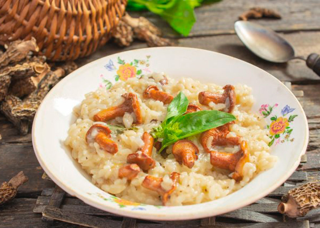 Ульяне Герасимовой нравится готовить, и одно из ее самых любимых блюд - итальянское ризотто с сухими и свежими грибами. Получается невероятно вкусно! Ингредиенты: 120 г круглого крупного риса, 2-3 сушеных белых гриба, 200 г свежих (или замороженных) лисичек, 1 луковица, 200 г белого сухого вина, 600 г куриного бульона, 30 г сливочного масла, 30 г сыра пармезан, соль, оливковое масло, чеснок по вкусу. Нарезаем луковицу мелкими кубиками. По желанию к луку можно добавить зубчик чеснока. Для приготовления ризотто подходит глубокая сковорода с толстым дном или жаровня. Наливаем в сковороду оливковое масло, бросаем нарезанный лук. Обжариваем лук на среднем огне около 5 минут, пока не станет мягким. Лисички замачиваем в холодной воде, промываем, отвариваем в кипятке 5 минут, откидываем на дуршлаг. Если они замороженные, то сначала оттаиваем их, потом варим 3 минуты. Когда вода стечет, добавляем лисички к луку, обжариваем несколько минут все вместе. Сушеные белые грибы нужно перемолоть в кофем