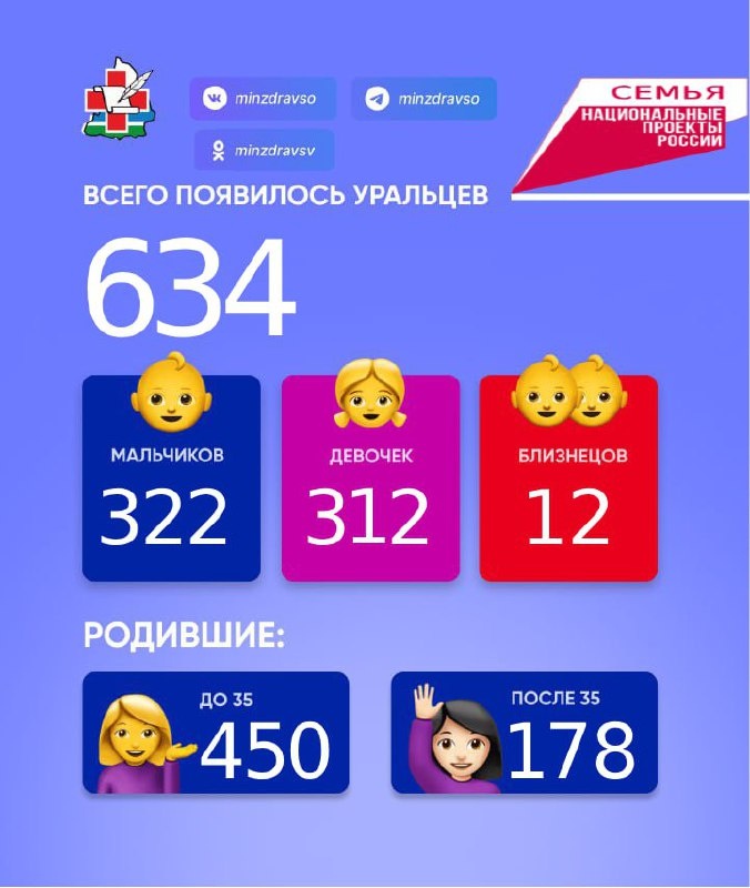 За прошедшую неделю в Свердловской области на свет появились 634 малыша: 322 мальчика и 312 девочек, из них 6 пар близнецов! 450 мам родили до 35 лет. 178 мамочек родили после 35 лет. Для двух свердловчанок это были восьмые по счету роды, а 198 новорожденных стали вторыми детьми у своих мам. @zg66