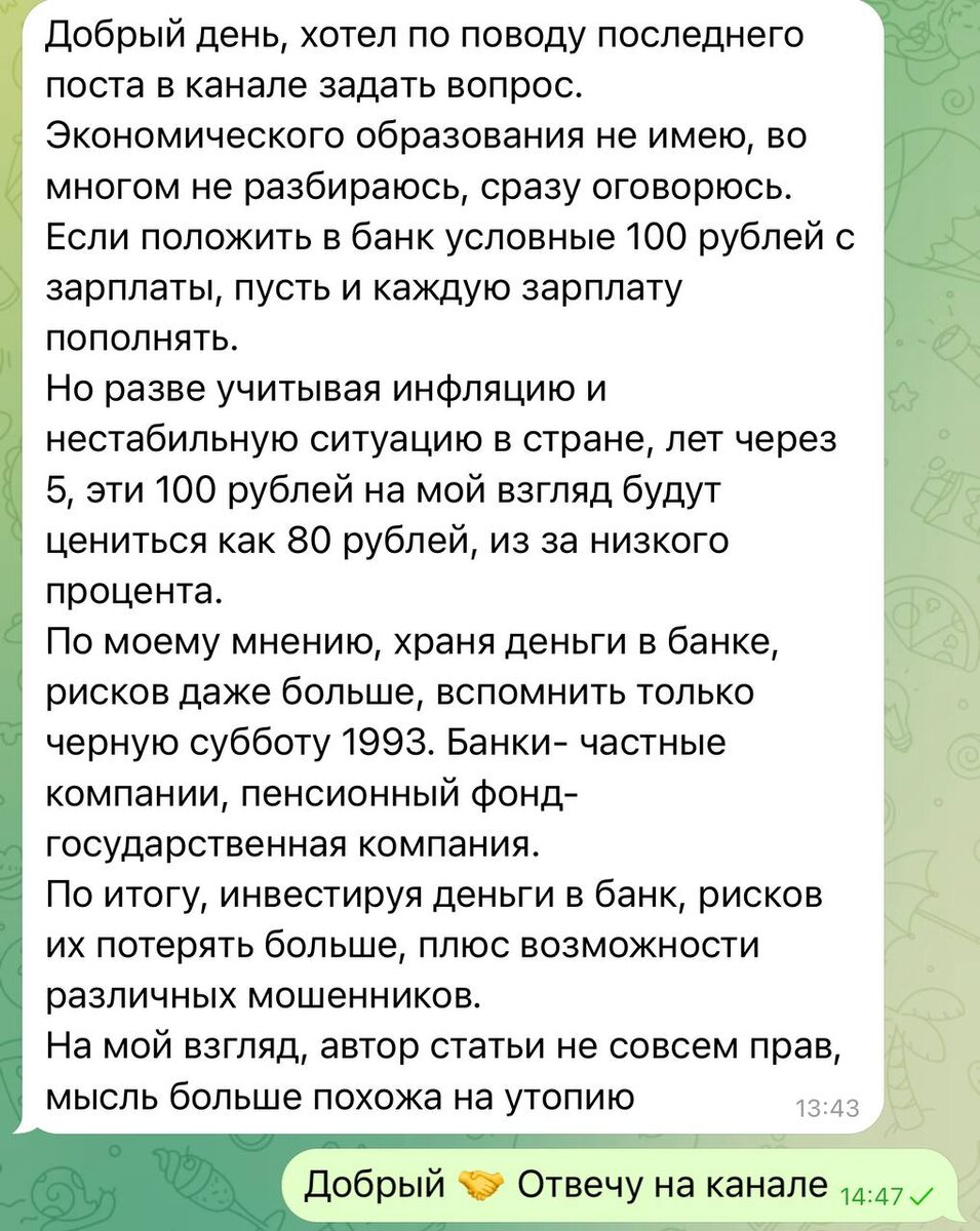 Чтобы получить пенсию 100к, надо 53 года иметь белую зарплату 230к - сейчас везде в новостях Тут ребята из @mgnzecon разобрали, что будет, если эти бабки в банк ложить: При зп 230к работодатель отчисляет в ПФР 22%, а это 50 600 рублей ежемесячно. Если каждый месяц это откладывать под 10% годовых, то через 53 года с эффектом сложного процента у вас будет без малого ₽1.2 млрд ( один миллиард двести миллионов рублей). В качестве альтернативы 1.2 млрд. государство предлагает 100к в месяц на пенсии. Очень сложный выбор. Подписчик пишет, про то, что нет экономического образования и т.д., но чтобы быть финансово грамотным экономическое образование и не нужно, тем более, что в большинстве российских ВУЗах экономическое образование плохое, я получал плохое образование. Всё работает гораздо проще. Вы просто начинаете потихоньку откладывать сколько можете и походу начнёте разбираться. Для людей, которые не в теме инвестиций, есть два простых и безрисковых инструмента, это «банковские вклад» и