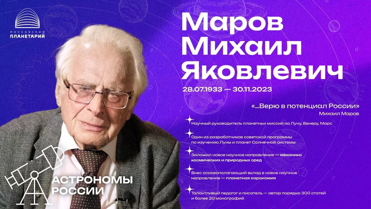 Сегодня мы посвящаем наш рассказ Михаилу Яковлевичу Марову. Михаил Яковлевич Маров – выдающийся советский и российский астроном, академик Российской академии наук, академик Международной академии астронавтики, специализировался в области механики и физики космоса, астрофизики и планетных исследований, математического моделирования космических и природных сред, один из инициаторов и научных руководителей исследования Венеры, Луны и Марса из космоса. Его именем названа малая планета Солнечной системы 10264 Marov = 1978 PH3. Михаил Яковлевич стоял у истоков космических исследований в нашей стране. Он играл ведущую роль в подготовке и осуществлении исследований Луны, Венеры и Марса, которые получили мировое признание. Результаты этих исследований во многом способствовали решению сложнейшей задачи обеспечения работоспособности посадочных аппаратов «Венера» на поверхности планеты и передачи на Землю панорам ее поверхности и измерения состава пород. Эти достижения являются уникальными, и их н