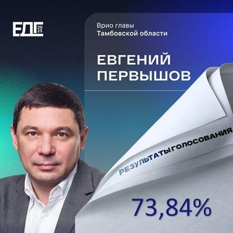 Евгений Первышов одержал победу на выборах губернатора Тамбовской области с результатом 73,84% По итогам обработки 100% бюллетеней его поддержали большинство жителей региона. Конкуренты показали следующие результаты: 🟦Андрей Жидков от КПРФ — 9,93% 🟦Олег Морозов от ЛДПР — 5,45% 🟦Павел Плотников от СРЗП — 5,45% 🟦Елена Семилетова от «Новых людей» — 4,03% Голосование прошло в спокойной обстановке. Поддержка Первышова зафиксирована во всех районах области. Это подтверждает высокий уровень доверия к действующему руководителю и ожидания жителей на продолжение курса развития региона.
