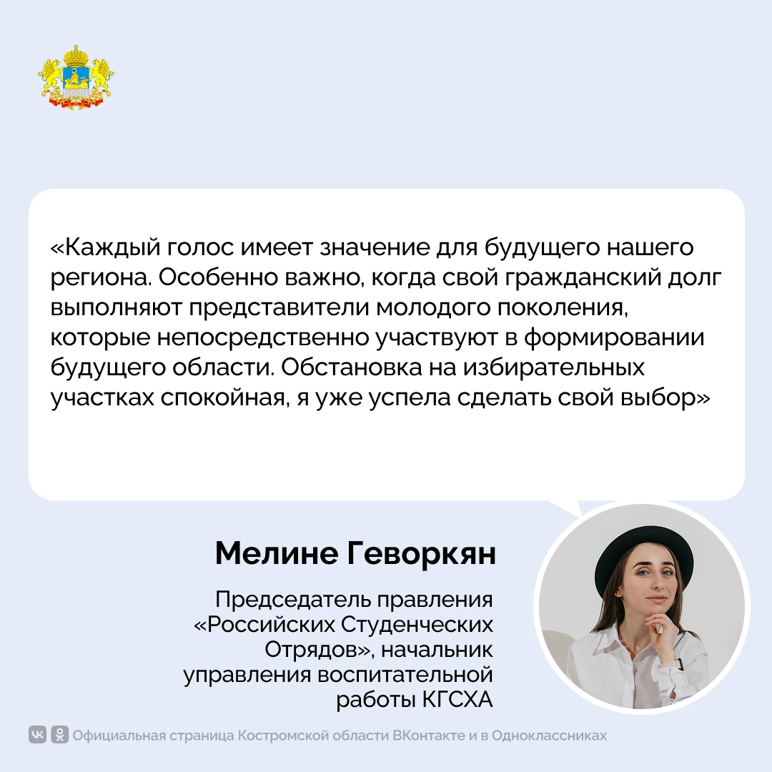 Важность участия молодых людей в избирательном процессе отмечает председатель правления «Российских Студенческих Отрядов» Мелине Геворкян. Девушка уже сделал свой выбор очно, на избирательном участке. По мнению Мелине, именно голосование позволяет формировать будущее региона.